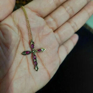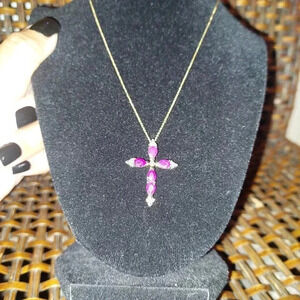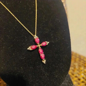 FAS 925 Silver Over Gold Vermeil Fuschia Cross Diamond Pendant & 18" Necklace