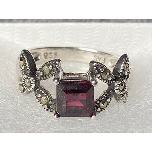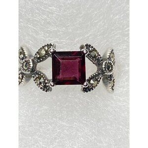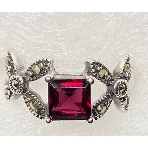 FAS 925 Vintage Deep Pink Square Cut Tourmaline Ring SZ 6 with Marcasite Flowers