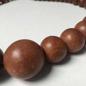 7) Wooden brown beaded necklace: lobster claw clasp, 28", good condition