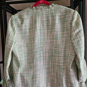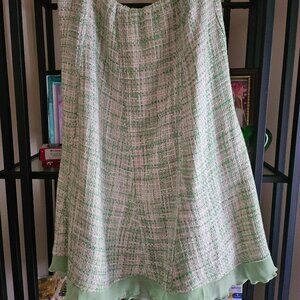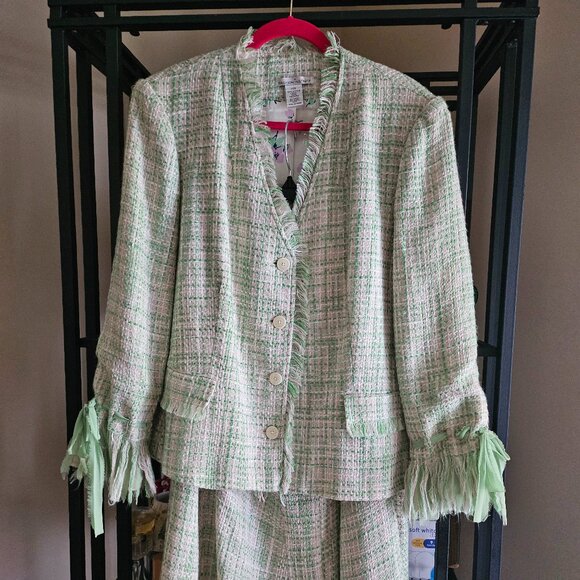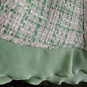 Fashion Instinct Jacket and Skirt Suit. Green and beige Tweed with pretty flowers lining inside the jacket. The jacket has pockets and the fringe. The skirt has a green ruffle hem and a slight A-line. The jacket is 24" in length and the skirt is 26" in length. The body is 100% Polyester and Lining is 100% Acrylic.