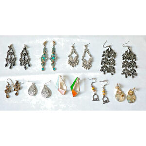 Lot of 9 various designed fashion jewelry earrings. These are all different styles of dangly type earrings. They are all for pierced ears. Some of missing the earring back. Various colors and materials. Rhinestones, enamel, metal - mother of pearl.