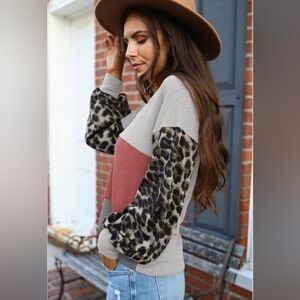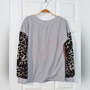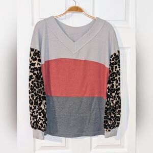FASHION JUNKY Gray Leopard Contrast Sleeve Colorblock Waffle Knit Top M NWOT