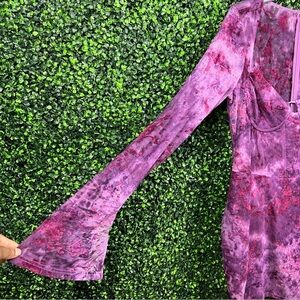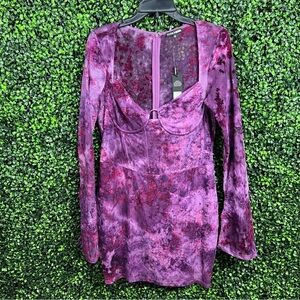 NWT. Elegant purple dress with velvet floral pattern. Long sleeves and fitted design. Sheer/semi sheer sleeves & corset bodice. Lined skirt. Rear hidden zipper. Perfect for a night out. Smoke/pet free.