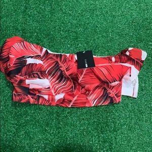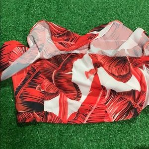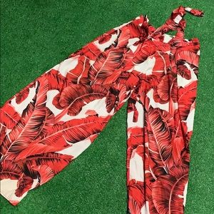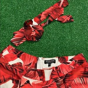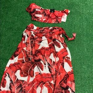 this set is brand new! the top fit weird, so my mom decided not to keep it. the top zips up on the side and has rubber on the bottom to stay in place and a ruffle to conceal some of the crop! it’s also off the shoulder~ the pants are wide legged and flowy NOT STRETCHY, but have a zipper, belt loops; and a ribbon for the belt. perfect for summer :]