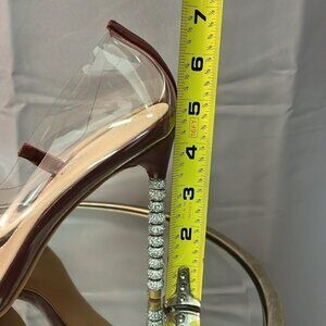 EUC FASHION NOVA size 8.5 women’s stiletto high heels with rhinestone inlay on the portion of stiletto heel. The top side of the body of the shoe is made of crystal clear see through vinyl. The sole of the shoe is trimmed in burgundy wine color.