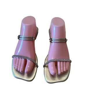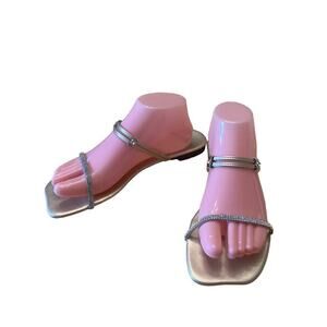 FASHION & SHOES metallic vegan leather and crystal strap slides. Size EU 40, US 9.5. New Without box. Dress these up or down. Metallic vegan straps and footbed. Strap across the toes is adorned with 2 rows of small clear crystals. 2 straps at the ankle are held together with little movable gold tone and crystal decorations. These move so you can set them on top or on the sides, or somewhere in between. Whatever you think looks best. Lightly padded footbed. Rubber sole. A simple way to dress up an outfit.