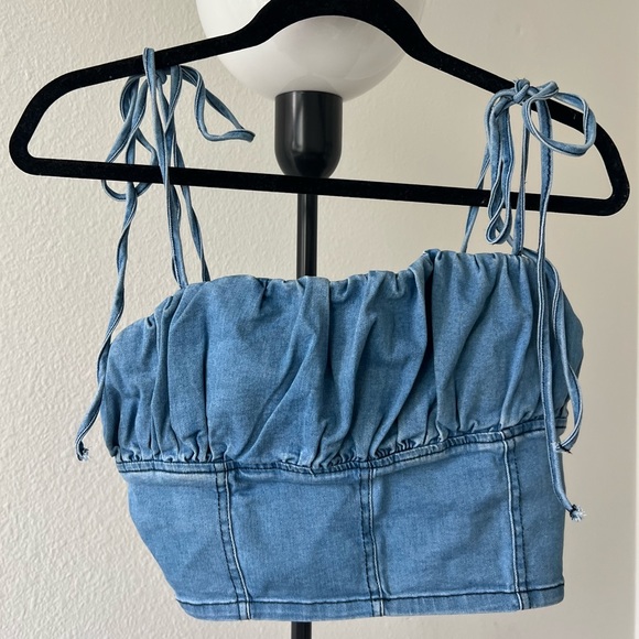 Cute Denim Crop Top with adjustable shoulder straps. Worn once. VERY stretchy, soft, & comfortable!