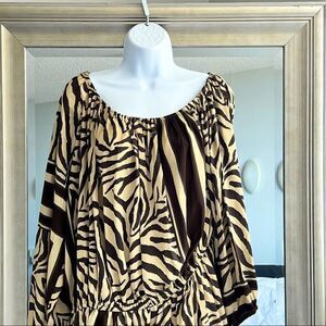 brown & ivory zebra print sheer flowy mini dress. Elastic high waist, cold shoulder with flowy sleeves & drawstring w/gold hardware, NWT