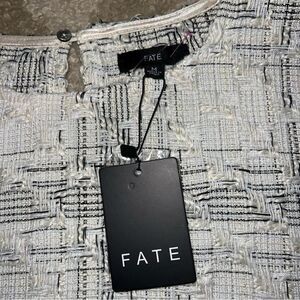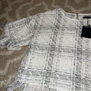 Stylish plaid top with fringe detailing. Features a classic black and white pattern.