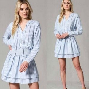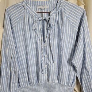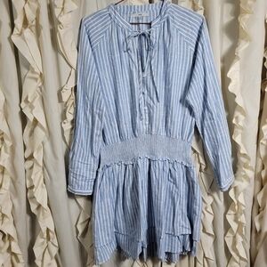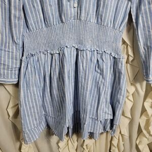 FATE Linen Blend Striped Dress. Smocked waist, Button Front and Long Sleeves. Mandarin collar with self tie. Button cuffs. Tiered skirt. Mini length. No pockets. Medium weight. Excellent condition, no flaws.