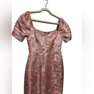 This dress is new with tags! Pink floral gold metallic shimmer print. Short puff sleeves. Sweetheart neckline. Pencil style dress. Women’s size small. 1.6.24 SS