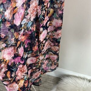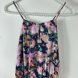 Adjustable shoulder straps. Sheer overlay. Lined to knee. Super pretty with sheer part on bottom. Navy blue based with pink floral.