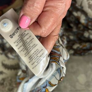 Charming floral top with a V-neck design. Features vibrant blue and white floral design. Pleated sleeves with a zippered hem. Size small. Excellent condition