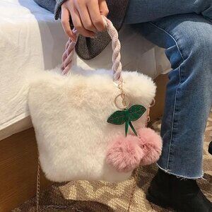 New in original packaging. Off white faux fur. Twisted rose colored velvet handles. Fully lined. Chain is included for use as a shoulder bag. Cute, trendy, & FUN! This piece adds some whimsy to your wardrobe.