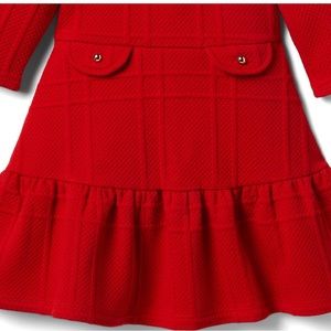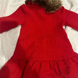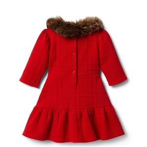 It's a holiday mood in this festive dress with a soft faux fur collar, ruffle hem and gold-tone button details.