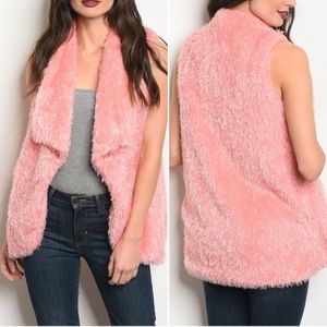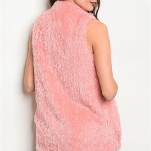 FAUX FUR PINK SHAGGY VEST! UNIQUE ITEM! has a pocket at each side for easy storage. Fit's true to size with a loose fit design. Fabric Content: 100% POLYESTER Size Scale: S-M-L Sleeveless open front fuzzy vest B365
