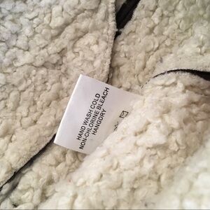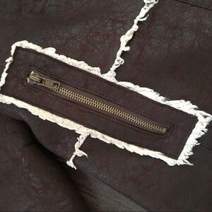 It’s a pattered dark brown faux leather coat with a fluffy faux fur collar. It has a cream Sherpa inside. It’s a shortie coat style. Looks brand new....I wore it maybe twice. From a smoke and pet free home.