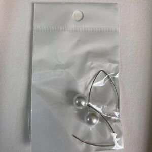 A pair of folded, wire threaded type drop earrings with synthetic pearls. Very dainty and beautiful. Classically timeless earrings. Silver toned zinc alloy. The front side with the pearl hangs approx. 4cm, the back end hangs approx. 3cm.