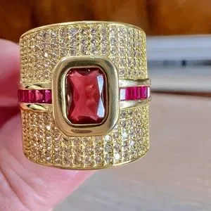 This ring is absolutely gorgeous. I purchased it from a high end Boutique. I have 3 Ruby & Diamond rings so that’s the reason this one needs a new home. Looks real, I have a Emerald green one also & everyone says it looks real. Great to take on vacation, special occasions or just everyday wear.
