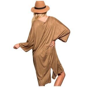 Pol Camel Split Faux Suede Dress with Metallic Studded Trim