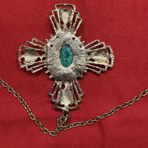 FAUX TURQUOISE BLUE SCARAB PENDANT ANTIQUED SILVER COLOR CROSS NECKLACE 24" chain- golden brassy color