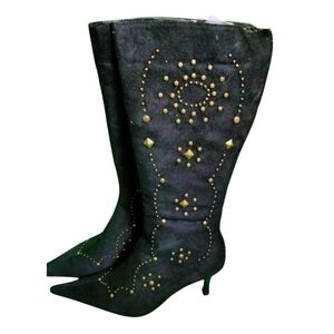 faux suede studded boots all man-made material brass studs . these have extreme pointed toe very witchy . would be perfect for costume or for photography. if you're hard on boots I would say that these wouldn't be the boots for you unless you scotchgarded them before you wore them. these are size 6 original retail 119 I would say these run very narrow because of how the design is would also be perfect for pirate costume or cosplay. 3 inch heel