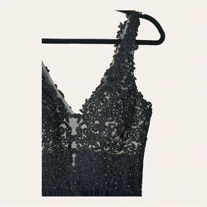 DETAILS: BEADING; EMBROIDERED; FIT AND FLOW; MESH ON TOP; PADDING; ZIPPER AND HOOK/EYE IN BACK FOR CLOSURE