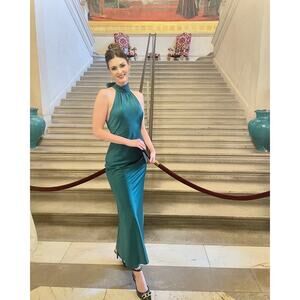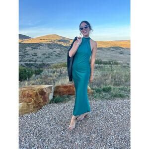 FAVIANA Green Satin Sleeveless Halter Neck Thigh-High Side Slit Gown Dress sz 14