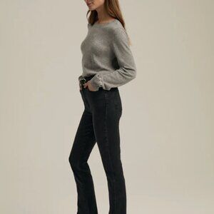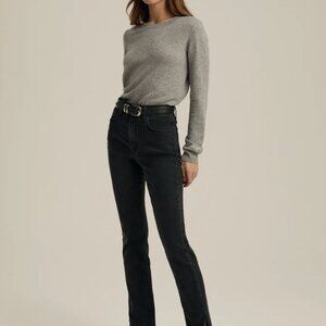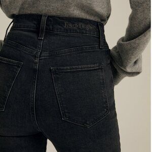 The Valentina Tower features an 11.5" rise and a 34" inseam for a leg-lengthening fit. This faded black wash with slit side seams and raw hems gives The Valentina a bolder-than-bold look and the stretch gives this denim a well-fitted silhouette. (Favorite Daughter embroidery on the back waistband, of course.)