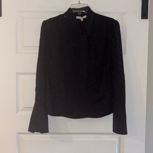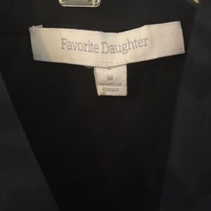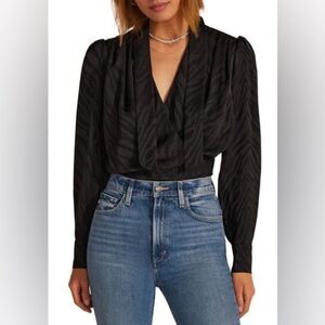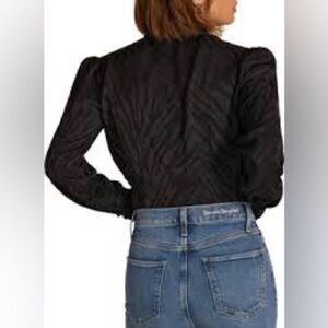 FAVORITE DAUGHTER The Joan Zebra Jacquard Blouse In Black Zebra, size medium. New without tags! Sweet meets softly savage in a puff-sleeved blouse covered in tonal zebra stripes. V-neck Long sleeves 100% polyester Dry clean or hand wash, dry flat Imported. Extra replacement button still attached to care tag.