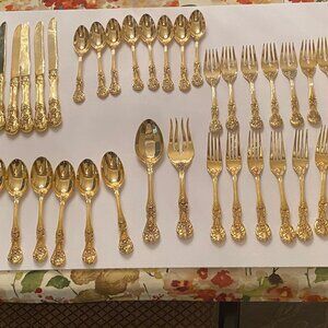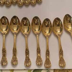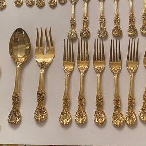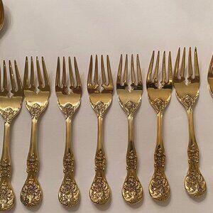 Gold plat flatware in an ornate floral pattern