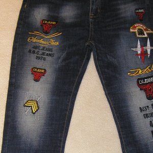 MEN Vogue Fashion Jean (Size 36 Long) Distressed Spandex Denim (Straight Leg) Embroidery