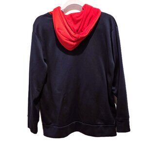 * Pullover, with a front hand warmer pocket and red and blue drawstring for the hood.