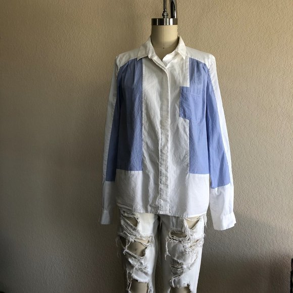 Concealed button placket, Patch pocket at chest, Button cuffs, Point collar, Unlined. No size tag, fits a S.