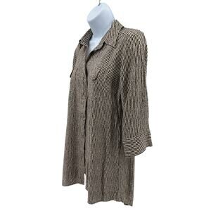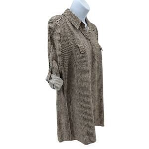 FDJ French Dressing Jeans Shirt Women's Size Large – Tan and Black Vertical Stripe Pattern, Classic Button-Up Front, Roll Tab Sleeves for Adjustable Styling, Lightweight Woven Fabric for Breathable Comfort, Relaxed Fit with Straight Hemline, Structured Collared Neckline, Polished Casual Appeal, Ideal for Layered Office Looks or Weekend Outings with a Modern Twist.