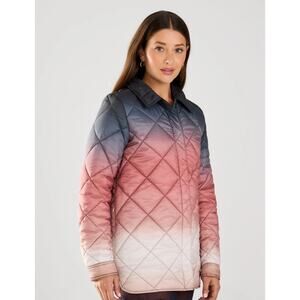 Add a pop of color and texture to your wardrobe with this quilted ombré jacket. Its rounded hem and gradient effect make it a standout piece for any season.