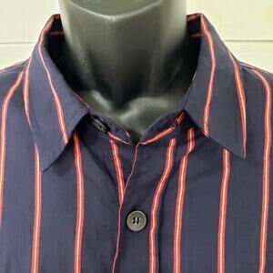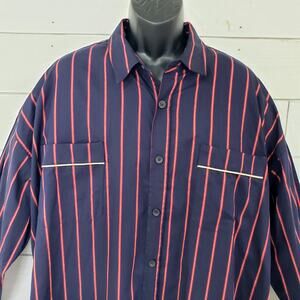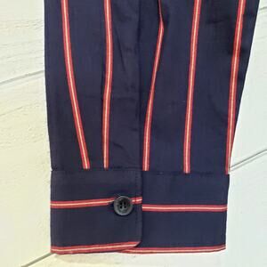Shirt is Navy Blue with red stripes. The red stripes have a smaller off white stripe going thru them. Very overized, Long sleeves, Button up front, Pockets at each side of chest with piping.