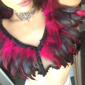 Only worn once for a couple hours and got sooo many compliments. A very unique mesh top covered with feathers and a ruffled satin trim.