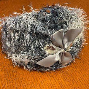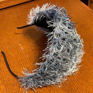 This auction is for a unique girls headband hat. Headband is black felt trim on the inside with a black headband. The “hat” portion is gray and blue fringe, like a headpiece attached to the headband with a rhinestone trim and a gray bow. Like new condition. Excellent like new condition with no stains or signs of wear.