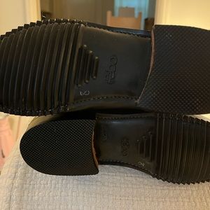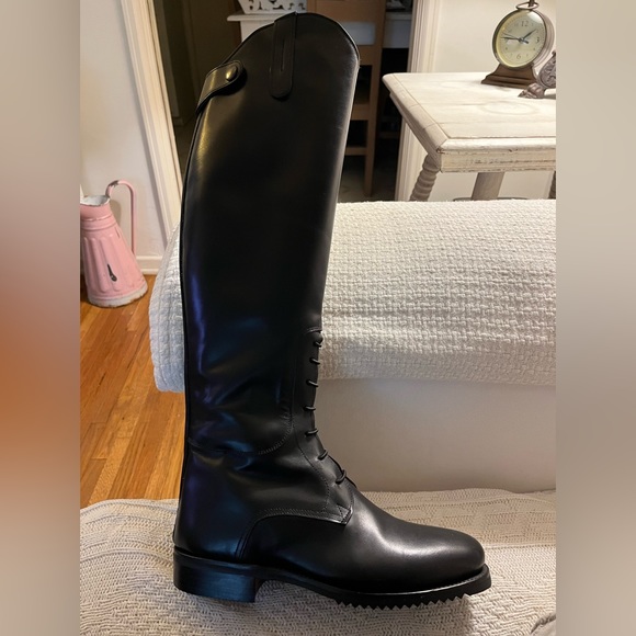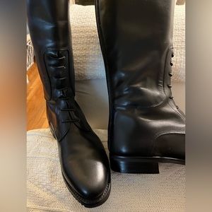 Riding Boot style. Beautiful black Italian leather. Slips on easy w/ back full-length zipper. Front lace-up embellishment. Perfect with dresses or jeans. Wear dressy or casual. Has leather strap w/ snap closure at top end of zipper. True to size. New. Never worn.