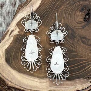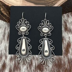 This stunning pair of sterling silver statement earrings by the world-famous Mixtec artist Federico Jimenez showcases exquisite craftsmanship. Featuring an elegant dangle design, each earring is adorned with an oval repousse shape on the hook and a gracefully elongated teardrop repousse dangle, both beautifully embellished with intricate scrollwork. The dimensional detailing adds depth and movement, making these earrings a striking addition to any collection. The lower back of each dangle is stamped with Federico’s hallmark and STERLING, ensuring authenticity. Purchased directly from Federico, these earrings are a timeless expression of artisan craftsmanship.