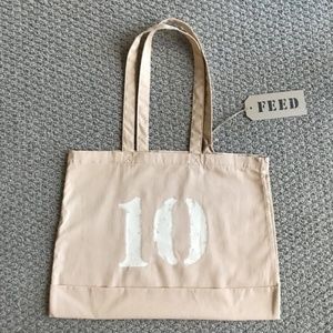 In new condition with tags. From gym to travel, the FEED 10 Bag was created with convenience in mind. We've brightened up this classic with an array of fun hues to make your daily routine a bit more vibrant. The number on each product represents the number of school meals provided with your purchase. Lightweight and foldable. Your everyday bag for all of your carrying needs. Use as a reusable grocery bag, to carry books or a change of clothes, and more. Fits an iPad or 13” laptop. 100% certified Organic cotton. Dimensions: 17.25” W x 14” H x 5.5” D. Handle drop: 11.5”.