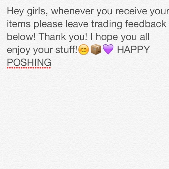 Ladies please leave all your feedback below! This feedback is for trades,purchases through poshmark and PayPal!!! Thank you so much! I hope you enjoy your items! Can't wait to receive mine! Happy poshing!ππ¦π₯π¬π¬π¬