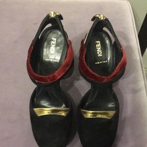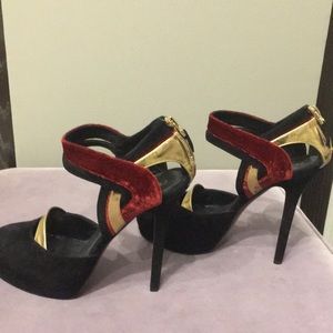 Black suede with burgundy velvet and gold metallic accent/design. Detailed zipper in back. Great condition worn once or twice .