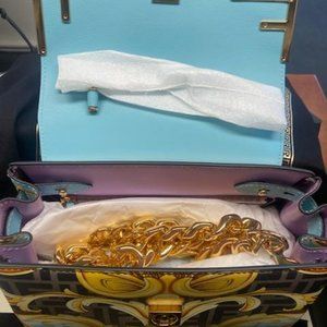 A creative dialogue between Kim Jones and Donatella Versace, Versace's signature La Medusa handbag is reimagined in the Fendace Gold Baroque print, adorned by a Medusa plaque and Fendi hardware at the flap.