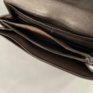 FENDI 2009 "Foglio Forever" wallet in a brown and yellow fabric featuring monogram pattern, black leather trim, and snap closure with gunmetal monogram buckle. Comes with box.