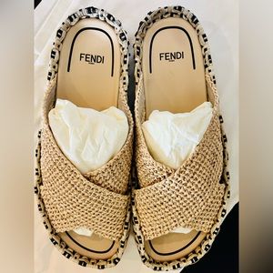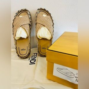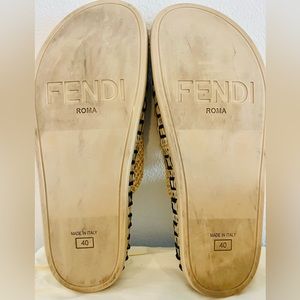 FENDI 7X1421 Sandalo Rafia Logo Slide Sandals Leather Viscose Sz 40 Pre-Owned