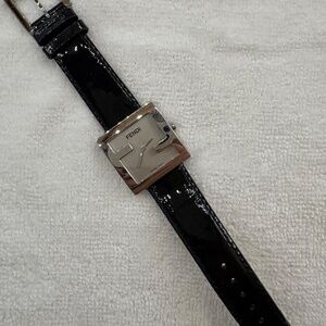 This is a Fendi women's watch with a stainless steel, square, peek-a-boo face and a black patent leather strap.