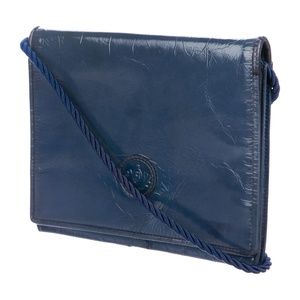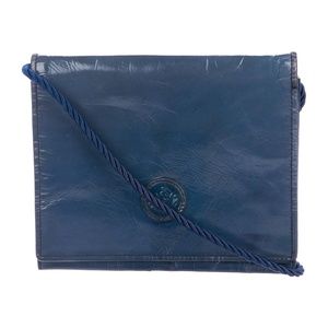 Blue patent leather FENDI crossbody bag with gold-tone hardware, single rope shoulder strap, heat-stamped logo accent at front face, tonal stitching throughout, tonal leather lining, single zip pocket at interior wall and magnetic snap closure at front flap. Shoulder Strap Drop: 22". Height: 6". Width: 7". Depth: 4.75". Condition: Moderate wear at exterior; Moderate wear at interior. Please see photos for more details. All measurements are approximate.