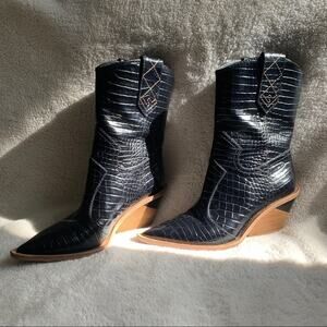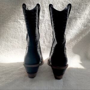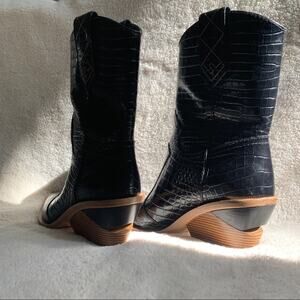 FENDI Black Embossed Leather Croc Cowboy Western Wooden Block Boots Size 37